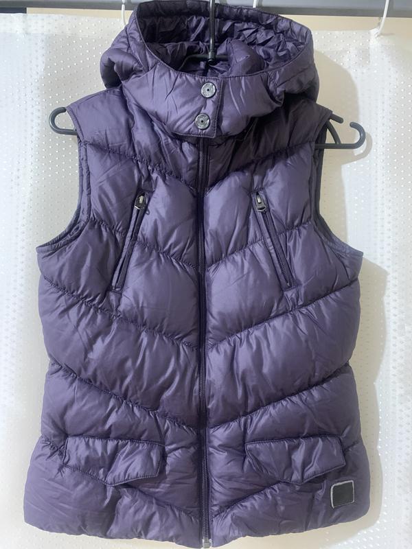 Жилетка наповнювач гусиний пух з капюшоном та вмісткими кишенями Заміри: напівобхват грудей - 44 см., стегна - 46 см., загальна довжина - 56 см.
