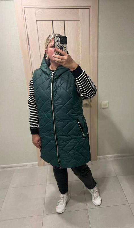Модель номер 2525 ‼️СУПЕР ЦІНА‼️ 850 грн 💣🧨 Жилетка длинная женская - эта красивая современная модель с модным силуэтом станет ключевой деталью для создания стильных образов. Блискавки основна, на кишенях, та по боках. 🧵 Тканина: плащова тканина лаке, синтепон 150 🎨 Цвет: зеленый 📏 Размер: 52,54,56 💰 Цена: 850 грн Замеры по изделию: Длина по спинке 100 см 52 р-ПО груди 55, ПО бедро 65 54 р-ПО груди 58, ПО бедру 67 56 р-ПО груди 61, ПО бедро 69 ‼️Есть обмен, возврат нет!!️