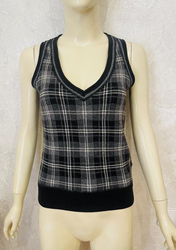 Mexx! Базовый жилет в клетку в серо-черном варианте!!! Спереди традиционная клетка тартан, сзади - гусиная лапка! Красивый V-образный вырез, внизу широкая трикотажная резинка! 100% коттон! Указан размер S-M, отлично тянется, подойдет на XS-S-M-L, ориентируйтесь на замеры: Длина от плеча - 53 см ПОГ - 42 см (тянется до 53 см) Полуобхват по низу - 32 см (тянется до 53 см) Идеальное состояние! 31-10-5