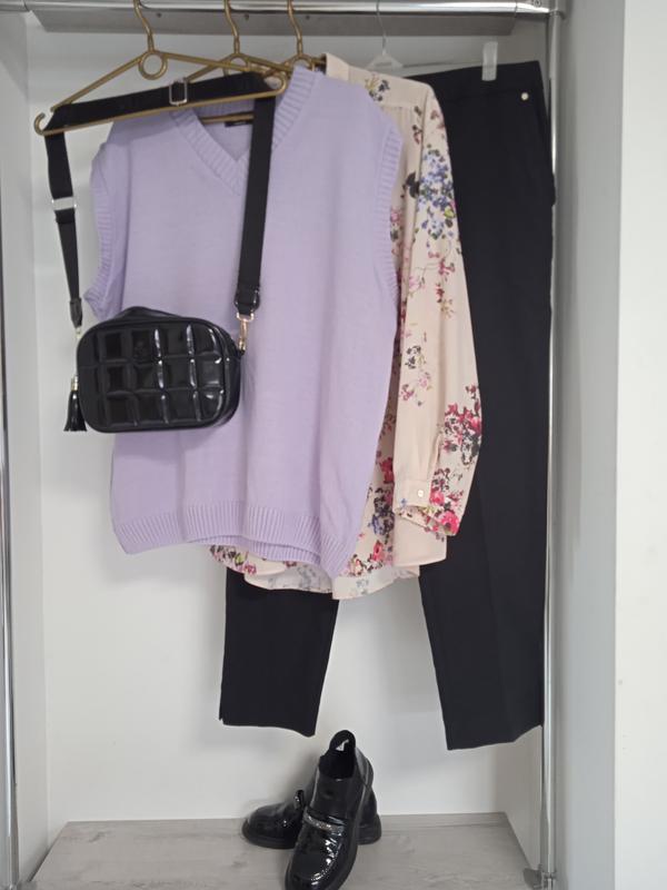 Классическая однотонная жилетка светло фиолетового цвета. Теплая и удобная. Приятная на ощупь. Гладкая машинная вязка. Нить средней толщины. Стрейч. Ложится по фигуре. Надежно смотрится поверх блузы или гольфа. Есть размеры. 58р на пог-62-64 56р на пог-60-62. 54р на пог-58-60 Дрвлина-72см