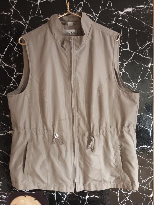 Опрятная, тонкая безрукавка на молнии.Талия регулируется шнурком. Есть карманы.С подкладкой.Комир-стойка. Производитель Германия Состояние новой. Замеры на фото Есть вопрос -пишите