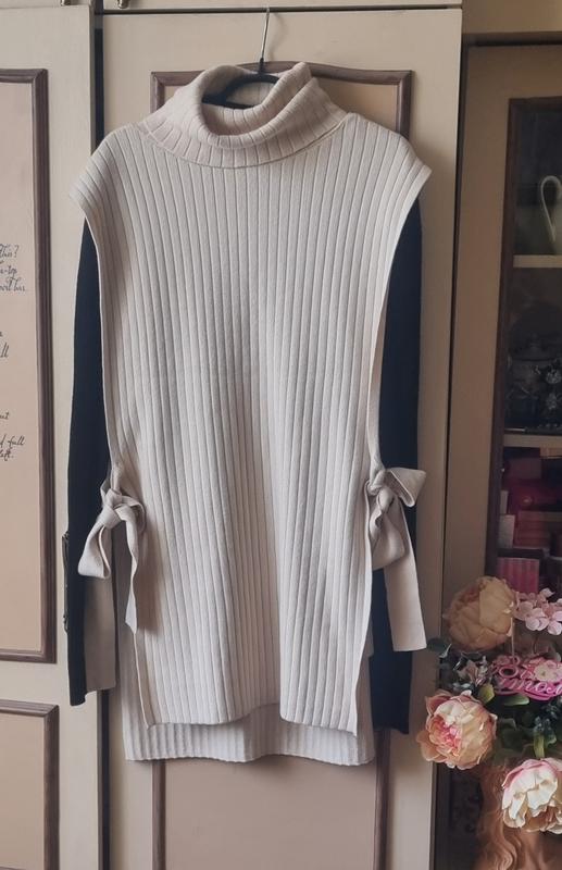 Очень стильная удлиненная безрукавка с горлом, связанная из смешанной пряжи (кашемир + хлопок) из коллекции H@M Цвет - топленное молоко. Связана в крупную резинку. С высоким воротом. По бокам - завязки, которые могут изменить размеры безрукавки Состав: кашемир - 50%, хлопок - 50% Размер: Евро - XS/S Замеры: ПОГ = ПОТ = ПОБ = 41 см. Длина - 75 см. Ширина плечей - 43 см