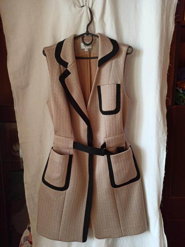 НОВЫЙ женский удлиненный жилет из фактурной ткани производства украинской фабрики, которая отшила на экспорт. Дело в стиле "тихая роскошь", цвет светло-бежевый с черной окантовкой, смотрится эффектно и очень элегантно. Можно стилизировать как с брюками, так и с юбкой. На подкладке, красиво держит форму, застегивается на потайные металлические кнопки, талию подчность пояс. Ширина под проймой 48 см, по талии 47 см, по бедрам 51 см, длина 86 см. Продажа по полной оплате на карту.