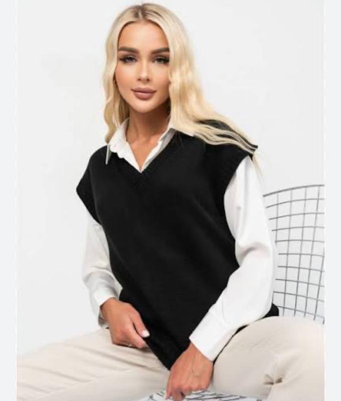 Обʼємний жилет з мʼякої пряжі «під мохер» з плечима оверсайз та драпіруванням на талії. Виміри в не розтягнутому стані: Довжина плеча - 20 см Напів обхват грудей - 65 см Напів обхват талії - 53 см (тягнеться до 65 см) Довжина від плеча до низу по переду - 56 см, по заду - 60 см.