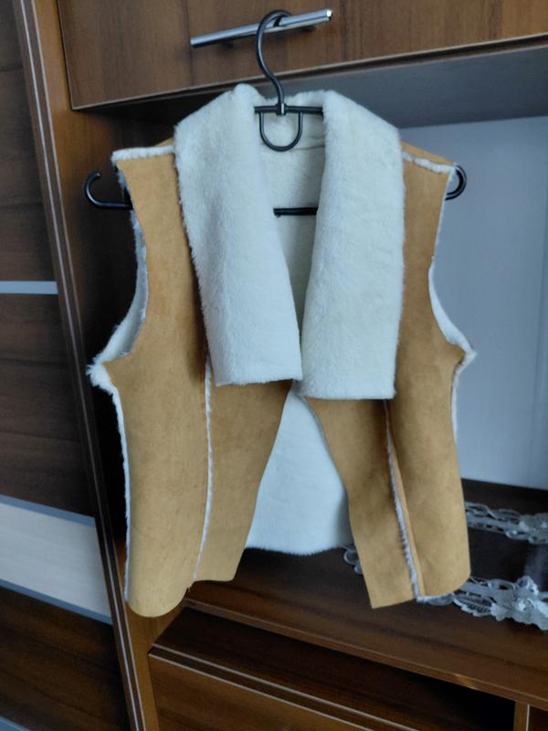 женская жилетка из замши и овчины. Материал: из искусственной замши светло-коричневого цвета. Внутренняя подкладка и воротник выполнены из белого пушистого материала, напоминающего овчину или стерженную шерсть. Дизайн: Жилетка без рукавов, с открытым передом и широким отложным воротником. Края обработаны так, что белая подкладка выступает наружу, создавая декоративный кант. Состояние и вид: выглядит новым теплым и уютным, подходит для прохладной погоды.