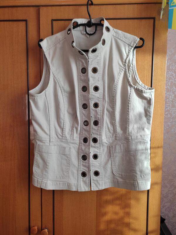 Жилетка джинсовая,ткань тянется.Застегивается на крючки.Есть два кармана