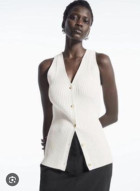 В этом сезоне COS переосмысливает стиль жилета строгих размеров, используя более приятные на ощупь ткани. Данное изделие выполнено в оттенке слоновой кости, имеет ребристую вязку из хлопковой смеси и длинный силуэт. Он предлагает безграничные возможности стилизации – носите его отдельно или поверх платья. Обычный крой, V-образный вырез Застежка на пуговицы Переработанный полиамид – это полиамид, изготовленный из текстильных отходов в процессе производства. ПО груди 44- 45см (при необходимости тянется) Длина 66см ПО талии 44см ПО бедер 45см Размер указан L, подойдет на М Стан - идеальный