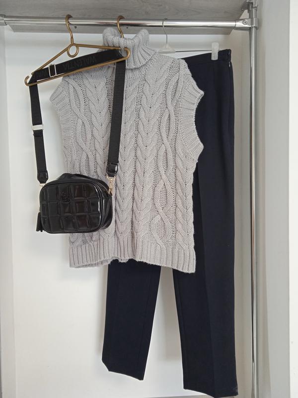 Классическая однотонная жилетка светло серого цвета. Теплая и комфортная. Приятная и мягкая на ощупь. Фактурная машинная вязка. Толстовка нить с ворсом. Тянется с легкостью. Фасон прямой. Ложится свободно. Плечи спущены. Аккуратный хомутик. Есть размеры. 52р на пог-56-58 50р на пог-54-56