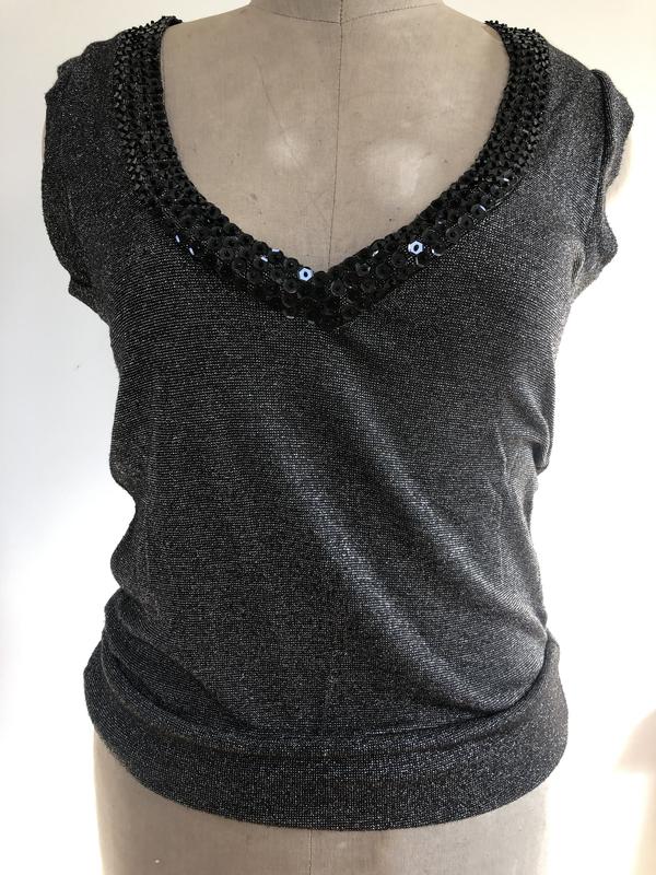 Безрукавка срібна з люрексом. Глибокий виріз. Прикрашений паєтками. Виглядає стильно ,святково. Гарне доповнення до вечірнього або святкового наряду.