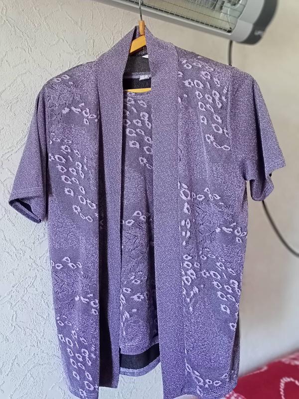 Продам стильный, удобный, стрейчевый комплект: футболку с накидкой женский размер XL. Состояние отличное. Цвет не передался на фото он не насыщенный, а в реальности, цвет насыщенный фиолетовый и очень красивый. Комплект смотрится отлично и нарядно, а так же хорошо тянется во всех направлениях. Поэтому замеры буду писать в спокойном состоянии изделия. Замеры: Футболка длина 61 см ( в спокойном состоянии), полу обхват подмышками 57 см, отверстие для руки 20,5 см, полу обхват по талии 54 см, по плечам 57см. Накидка: длина 70 см, полу обхват подмышками 55,5 см, полу обхват в районе талии 55 см, длина рукава от плеча 24 см, по плечам 43 см
