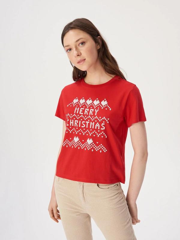 Футболка новорічна з принтом. Укорочена. 100% бавовна. В наявності розміри: S, L