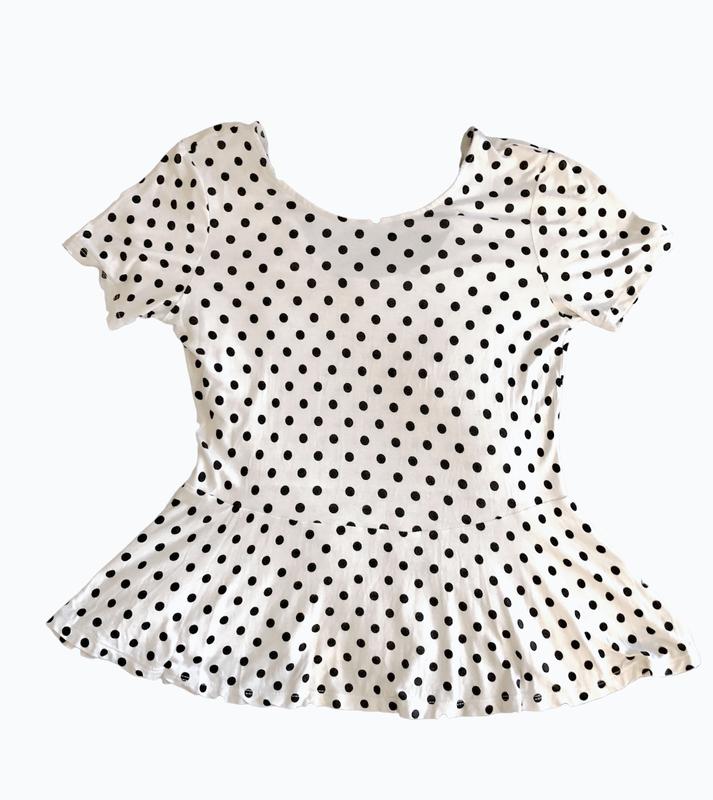 Крутецкая белая футболка в черный горошек George. С небольшой пелериной, сзади красивый вырез завязывается на бантик. Приятного качества, трикотаж. Размер S – М.