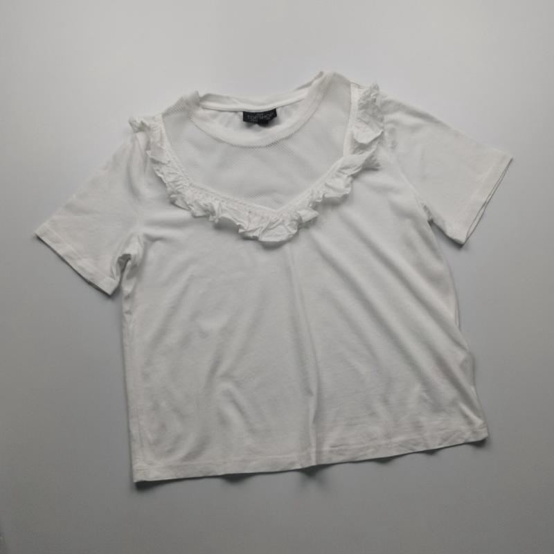 Классная белая футболочка со вставкой из сетчатого материала спереди и рюшами по контуру от британского бренда TOPSHOP. Состояние новой вещи - без бумажной бирки Размер UK6- XS Cостав: 53% модал 47% хлопок Длина 48см, ПОГ 42см в спокойном состоянии+ тянется