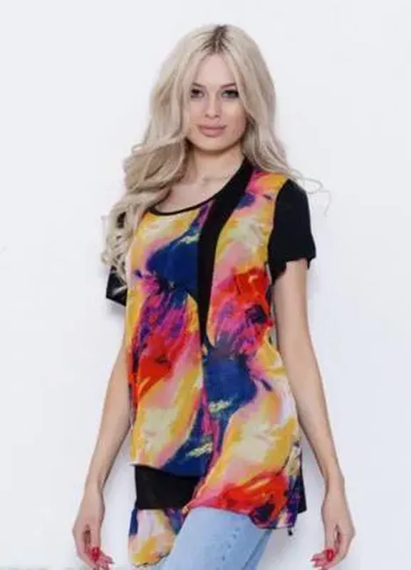 Черная футболка из эластичного тонкого трикотажа с прямым свободным кроем. Модель оснащено шифоновой принтованной передней вставкой удлиненного кроя с воланом сбоку, имитирующим запах. Материал: Комбинированный трикотаж/шифон Состав: 79% полиэстер, 21% эластан Длина: 74 Ткань: низкой эластичности Размер: М - ОГ(98см)
