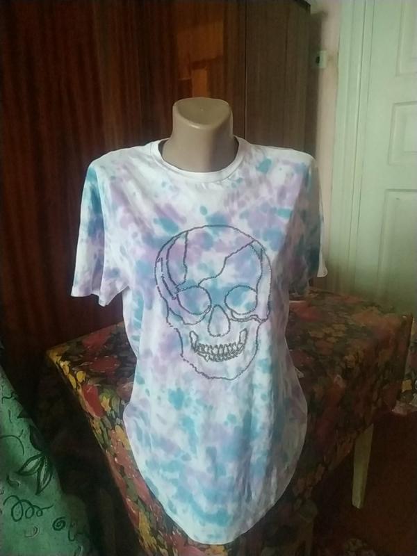 очень красивая футболка твй дай с черепом из бусинок.Ткань мягкая,хорошо тянется и отлично смотрится.Размер указано подростковый,но она оверсайз,подойдёт на хс,с,м Есть маленькая дырочка,на бирке(последнее фото). описание состояние очень хорошее длина 66 ширина груди 50