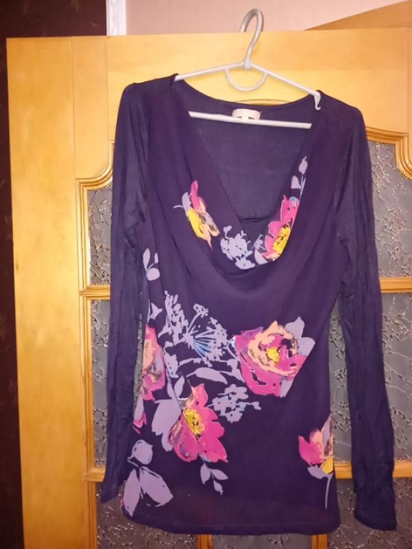 размер указан 12, на вискозной основе, длинный рукав, спереди шифоновая вставка с воротом- хомутом.