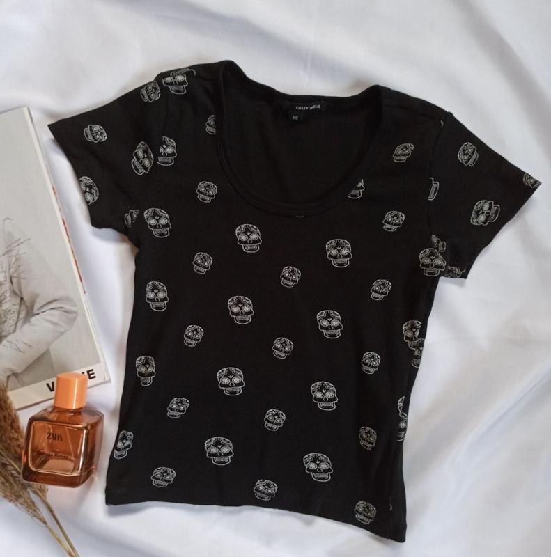 Черный топ с черепами ◽️размер: xs/s ◽️состояние: Идеальный 🏷 цена: 120грн Параметры: Длина: 45см Полуобхват груди: 33см