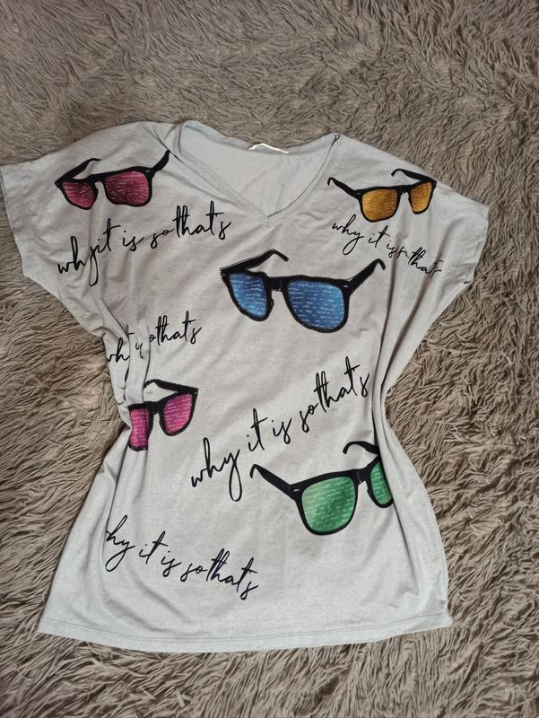 Женская футболка с очками. Модель – летучая мышь, ткань очень хорошо тянется. Замеры: ПОГ 62-70 см ПОТ 56-65 см Ширина по низу 50-65 см. Длина – 69 см.