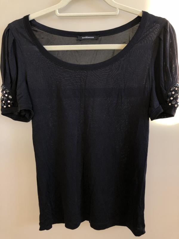 Футболка Roccobarocco черного цвета, украшена камнями и стразами на рукавах. Шикарный фасон, можно носить как футболку или как нарядную блузу под брюки или юбку. Размер M, замеры сделаю по запросу. Бирка с составом отрезана. Состояние идеальное, дефектов нет. Оригинал, куплена в Европе.
