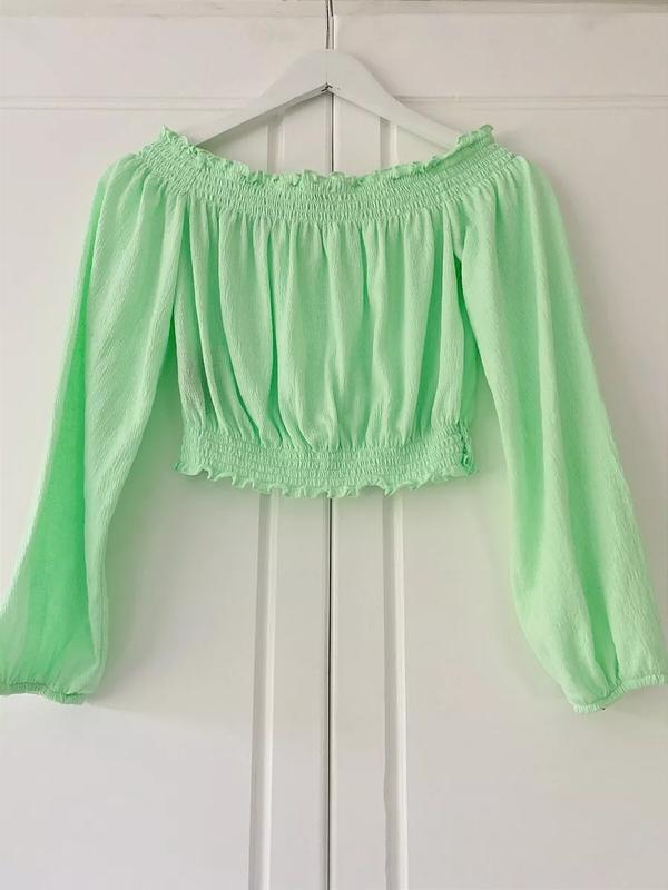 Женский трендовый стильный кроп топ с открытыми плечами от бренда H&M. Ткань приятная к телу люкс качество хорошо тянется, коттон. Свободного кроя, резинки на талии и плечах, красиво держат, крепкие но не передавливают. Размер универсал M-L. Стан - идеальный. Замеры : длина - 40 см, объем груди - 100-103 см, длина рукава - 56 см.