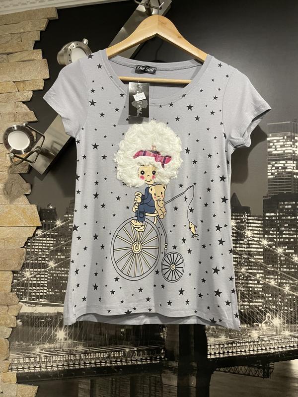 Гарна якісна футболка зі смішним принтом з нашитим декором зі штучного хутра,добре тягнеться,мило виглядає,розмір універсальний,підійде на XS/S/M,виробництва Польщі,склад:90%віскоза,10%еластан,нова,з паперовою біркою.Заміри:ПОГ 40 см в неростягнутому виді,довжина 60 см.Є ще в наявності в білому кольорі.