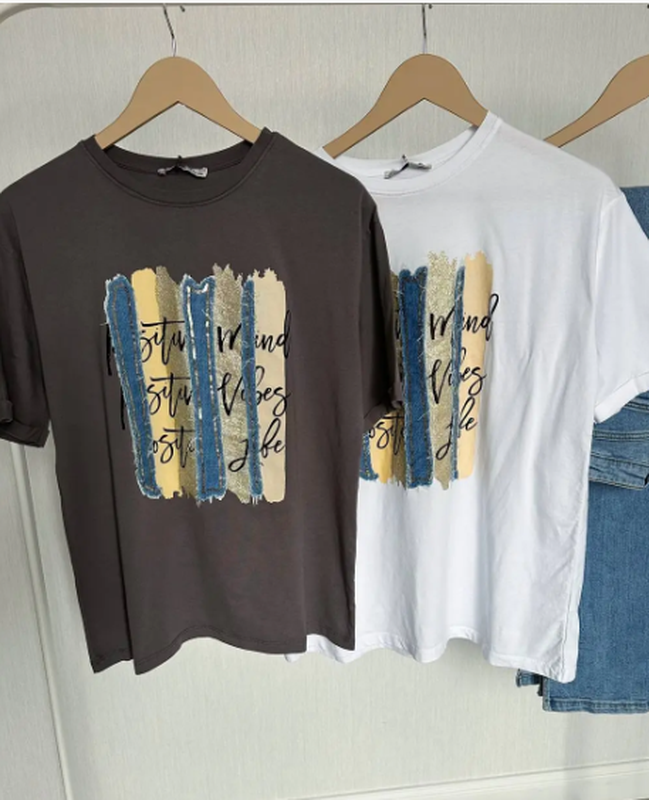 Стильная футболка оверсайз с аппликацией джинс+шимер+ пайетка и накатка Ткань; коттон Размеры: S,M,L Цвета как на фото. S ПОГ-54 Длина-65 М ПОГ-56 Длина -65 L ПОГ-58 Длина -66