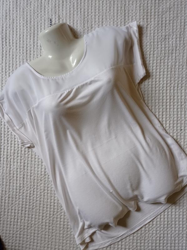 Футболка трикотажная,верх вставка шифоновая, ткань вискоза Размер указанный XL Замеры на фото, тянется