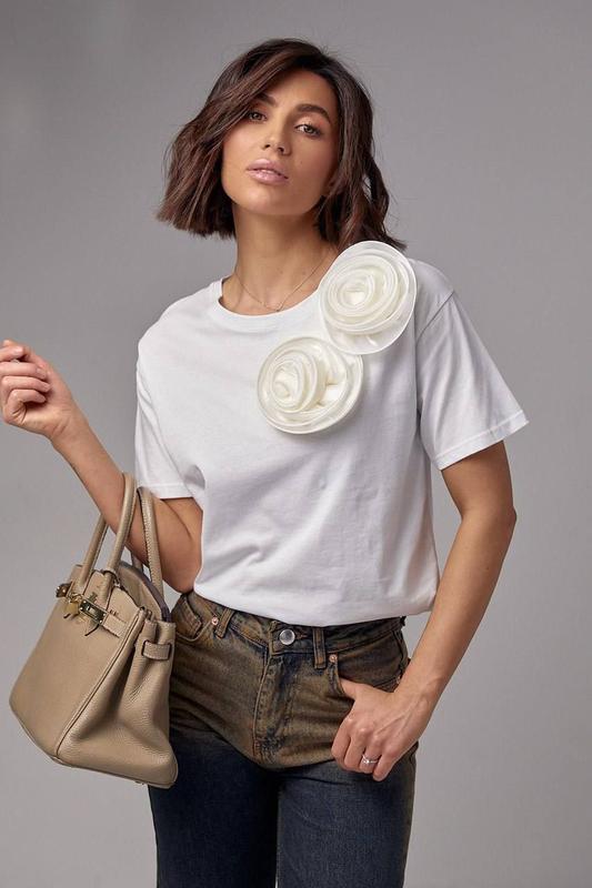 Арт 737-188 Трендовая футболка с 2 объемными цветками 🌺 ▪️размер: С, М, Л ▪️цвет: черный, молоко ▪️ткань: 100% хлопок, производство Турция