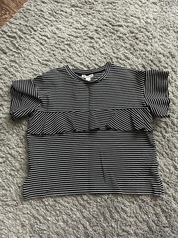 Очень классная классическая футболка в полоски. С рюшами, классно будет сочетаться с классическими брюками и даже с джинсами. Размер S Замеры: Длина 47 см Ширина по грудях 45 см Длина рукавиков 9 см