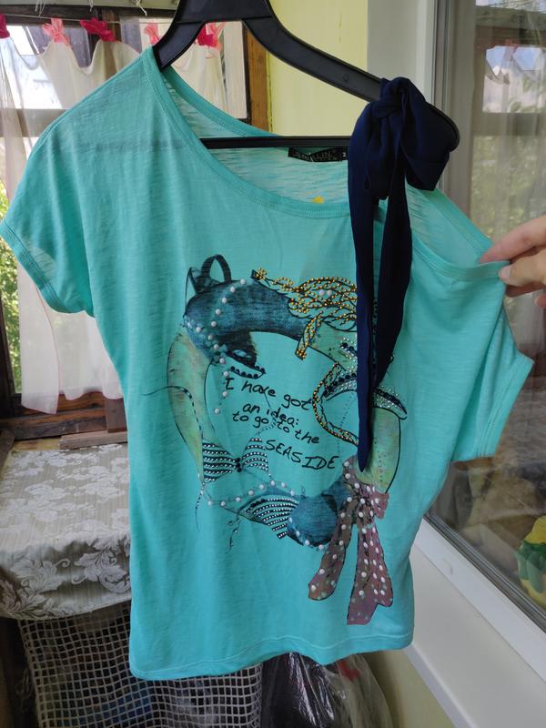 Красивая футболочка, бирюзового цвета. Необычный асимметричный верх и низ. Можна на S.
