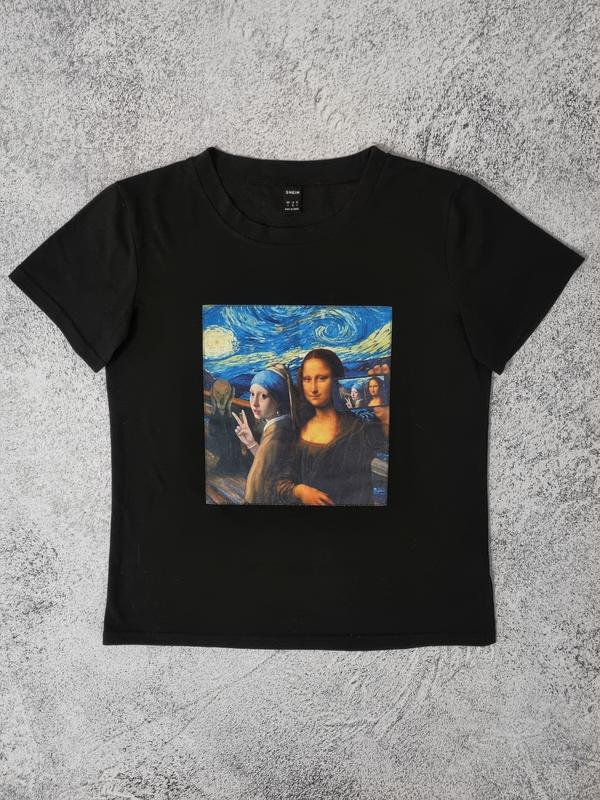 Футболка Shein в идеальном состоянии. Базовая чёрная футболка с интересным ярким принтом, на котором изображена картина Мона Лиза. Размер - S 97% Polyester 3% Spandex Замеры: Ширина между плечами - 38 см ПОГ - 46 см Длина рукава от плеча - 17 см Длина по спине - 59 см