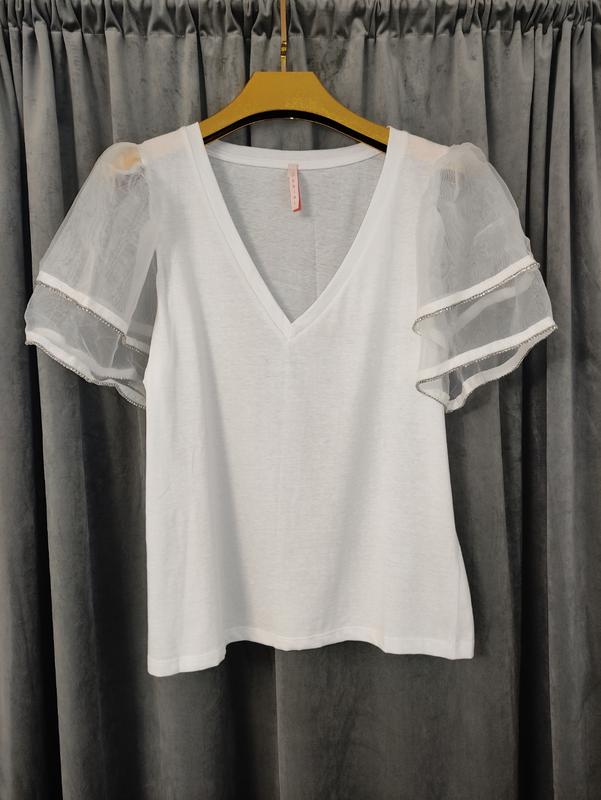 Белая футболка imperial, V-образный вырез, рукава фонарики (органза, украшенные камушками). Стан отличный, хлопок (бирка срезанная). Размер указан С, подойдет на С-М. Отстираю НП после оплаты на карту ПриватБанк, наложенным по предоплате или безопасной оплатой