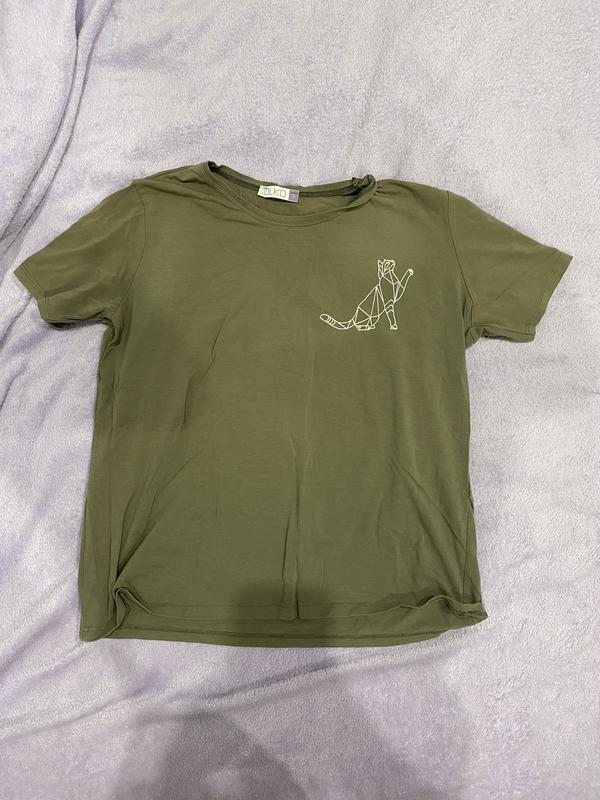 Футболка цвета хаки с принтом котика от OLKO S размер, свободная, не приталенная