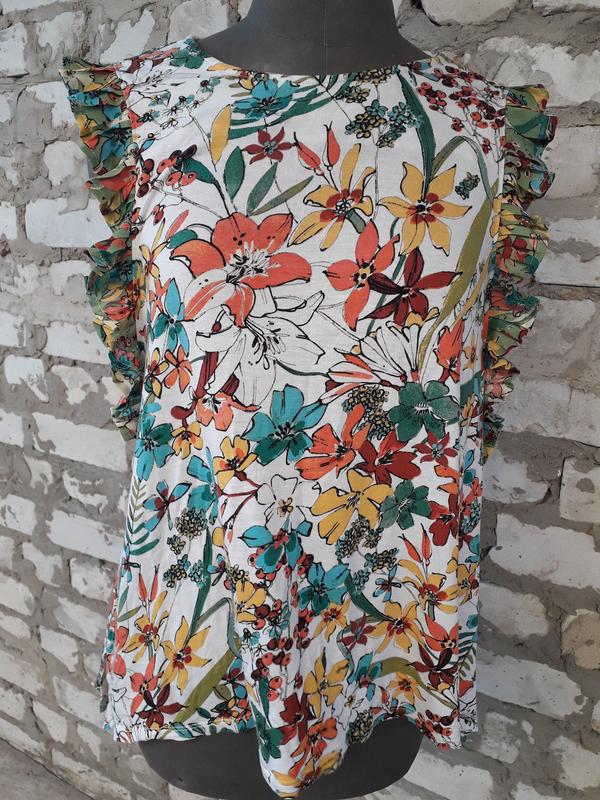 Футболка с рюшами, без рукава,сток.Размер стоит 18, на наш 56-58. Сделано в Бангладеш. Замеры: полуобхват груди-61; полуобхват талии-64; полуобхват бёдер-79; длина-65 см. Материал полиэстер.Низ футболки скроен по косой, по бокам разрезы,без нюансов.Рюшки отделаны шифоном, лёгкие.Цвет присутствует зелёный, жёлтый, бордовый, терракотовый. Очень красиво смотрится.