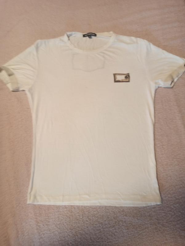Оригинальная брендовая футболка. На рукаве металлическая эмблема бренда. Нюанс - на аппликации оборвалась сетка.