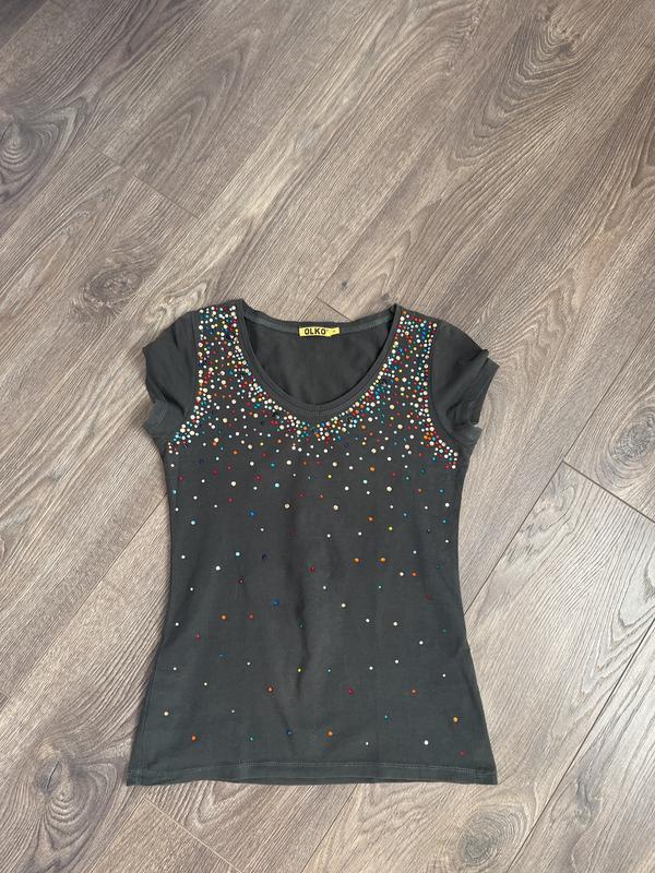 Жіноча футболка, оздоблена різнокольоровими стразами Розмір S Довжина 57 Бюст 38 По лінії низу 42 Рукав 12