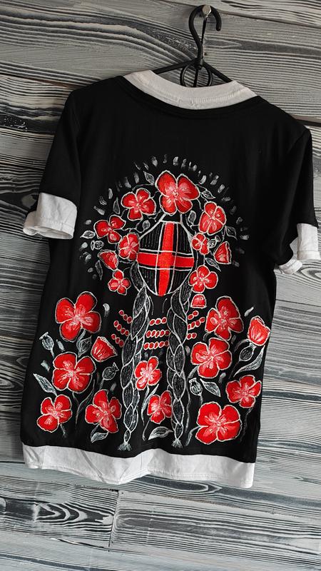яскрава футболка з малюнком мотонкою та маками. Футболка вже знайшла свою власницю, але я можу зробити ще. Якщо зацікавило пішіть із задоволенням відповім 😘