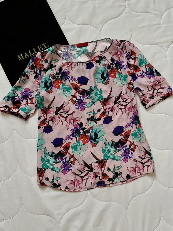 Красива шовкова футболка в квітковий принт від бренду Hugo Boss. Легка тканина, гарно переливається, дуже красивий принт. Матеріал - шовк Розмір - S Заміри: * Довжина - 60 см * ПОГ - 46 см * Ширина плечей - 37 см * Довжина рукава - 30 см Стан - ідеальний (є незначний нюанс (останнє фото)