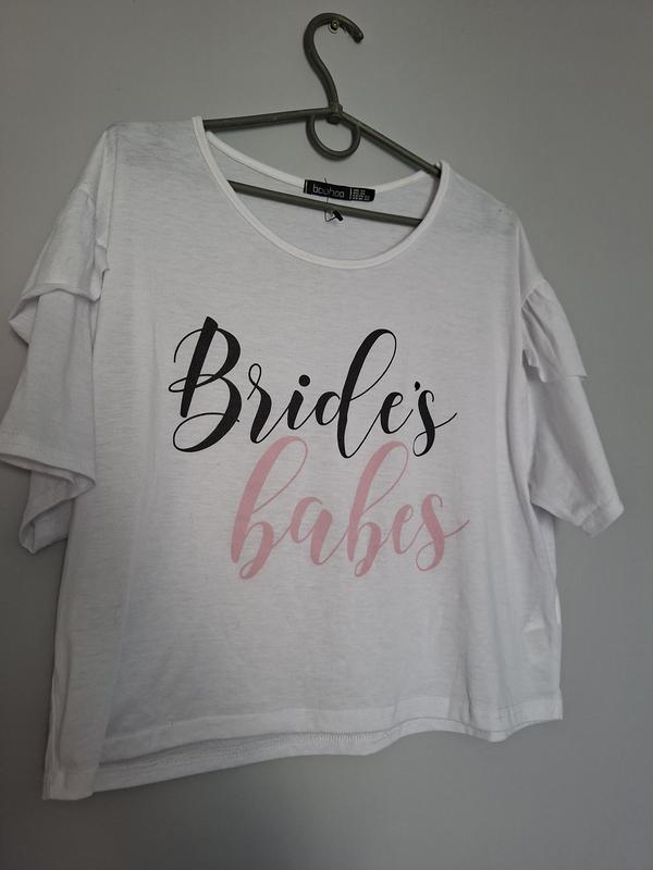 Продам веселую и стильную футболку от Boohoo с надписью "Bride's Babes". Идеально подойдет для девичника, фотосессий с подругами или просто для праздничного настроения. 48,5 см длина 50 см ширина