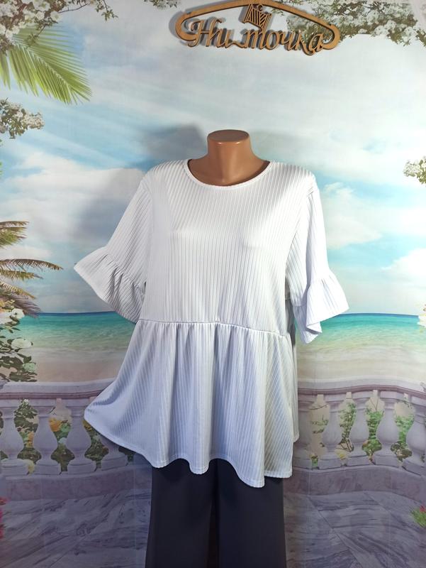 Предлагаю свободную футболку ! Размер 58-60-наш ( указан 52 евро) Фирма BOOHOO Фасон: свободный удлиненный силуэт, с оборкой от талии, в талии -резинка, рукав короткий с рюшем Цвет: белый, Ткань: тонкий,легкий трикотаж в рубчик, полиэстер - 95%,эластан-5% Состояние - отличное Длина - 72, полуобхват груди-64, полуобхват талии -55-65см, длина рукава с плечом -42см