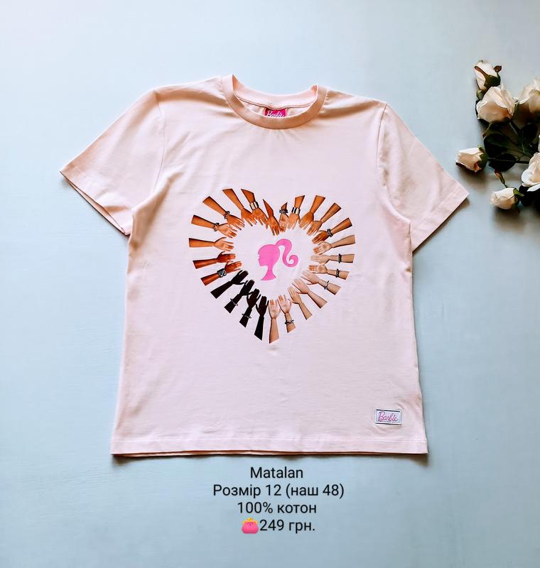 Футболка Барби от Matalan. Размер 12 (наш 48). Состав: 100% коттон. Замеры: длина по спинке 61 см, ПОГ 50 см, ПОТ 49 см, ПОБ 52 см, плечо 11 см, длина рукава 22 см. Состояние новое.