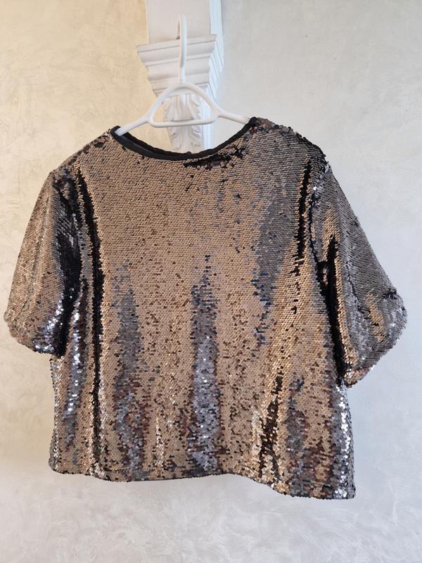 Темно-сира футболка в пайетках прямого кроя оверсайз. Полностью на подкладе, в рукавах тоже подклад тому пайетки не эолируют. Одеяла на объем груди 90см, талию 76см, рост 165см. В идеальном состоянии. Замеры: Плечи 49 Рукав 26 Подмышками 55 ПОТ 58 Длина 56 Отпрашиваю безопасной доставкой