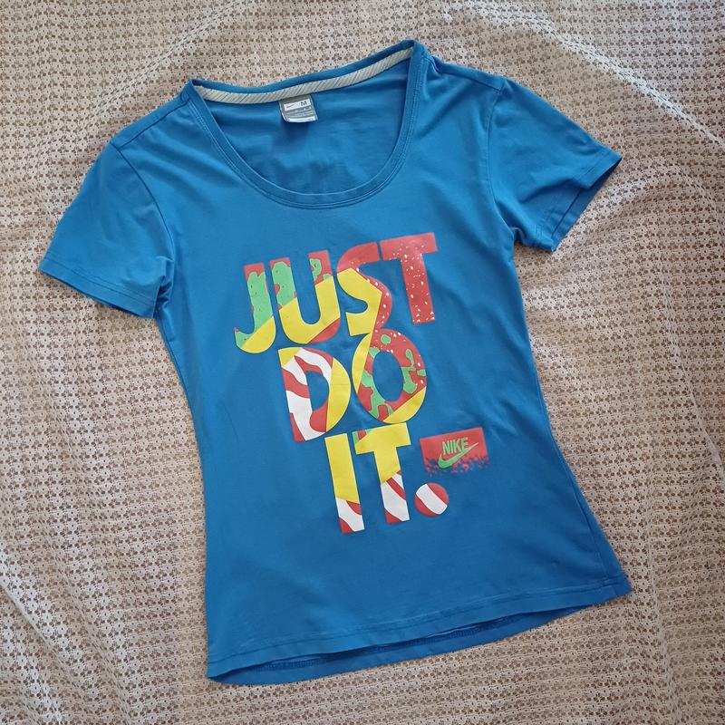 Синя футболка Nike Just do it 100%бавовна Яркий накат Состояние красиво, есть минимальные трещины по накату и мелкая пятнышка сзади внизу ближе к боковому шву ( последнее фото). Все в цене учтено Размер М Длина 59см, плечи 39см, под руками 41см, ПОТ 35см, по низу 42см