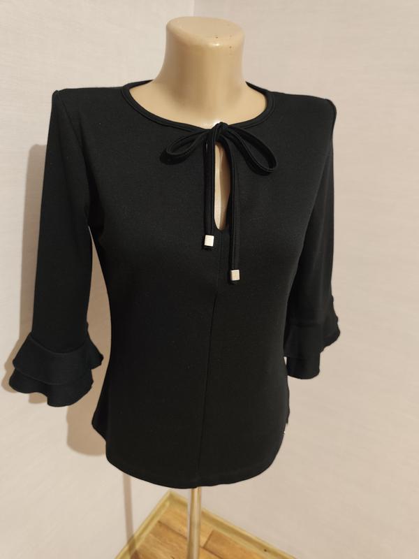 Представляем элегантную черную футболку- блузку от Mohito Collection, которая станет идеальной основой для вашего делового или нарядного образа. Классический черный цвет в сочетании с изящными деталями делает эту модель универсальной и стильной. 👚 Основные Характеристики Бренд: Mohito Collection Цвет: Черный Размер: S (Small) Фасон: Приталенный, подчеркивающий фигуру. : Качественный, плотный трикотаж(хлопок, лайкра), хорошо держит форму. Круглый вырез с декоративным разрезом "капля" по центру. Завязка: Изящный бант-завязка по горловине, который добавляет женственности и романтичности. Золотистые металлические наконечники на концах завязок, выполняющие роль стильного и дорогостоящего акцента. : Рукава длиной 3/4 с эффектными двухслойными воланами/рюшами на манжетах. Этот элемент добавляет динамики и игривости. Четкие линии плеч и приталенный крой создают аккуратный и профессиональный вид Универсальность: Идеально сочетается как с классическими юбками и брюками для офиса, так и с джинсами для повседневной носки. Изящные детали, такие как бант и металлический декор, позволяют носить блузку на праздничные события или вечеринки. : Качественный материал обеспечивает приятное ношение и хорошую посадку по фигуре. Не упустите возможность добавить эту стильную и элегантную вещь в свой гардероб!