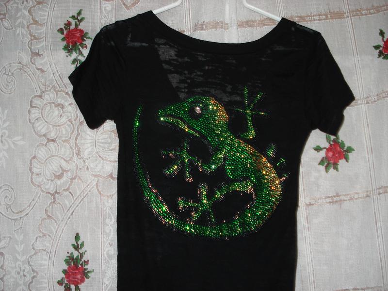 Шикарная,стильная футболка черного цвета-черная ткань состоит из выбитых цветов,но не просвечивается,сзади на спине чудная аппликация из черно-зеленой ящерицы,выложенной камушками,большой фигурный вырез,объем груди-80см.,ширина низа-42см.,длина футболки-72см.,Перу,50%коттон,50%полиэстер.