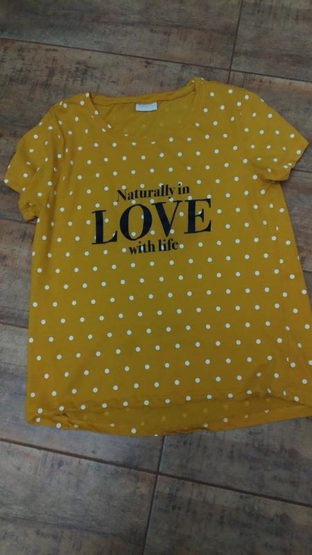 Стильная женская футболка теплого жёлтого цвета в белый горошек с надписью. Размер S .100% хлопок.Бренд Infynity.