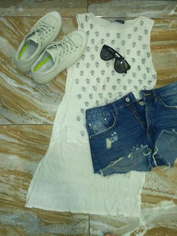 Майка прямого кроя, спереди как обычная, сзади удлинения, черепа блестят, размер S-M