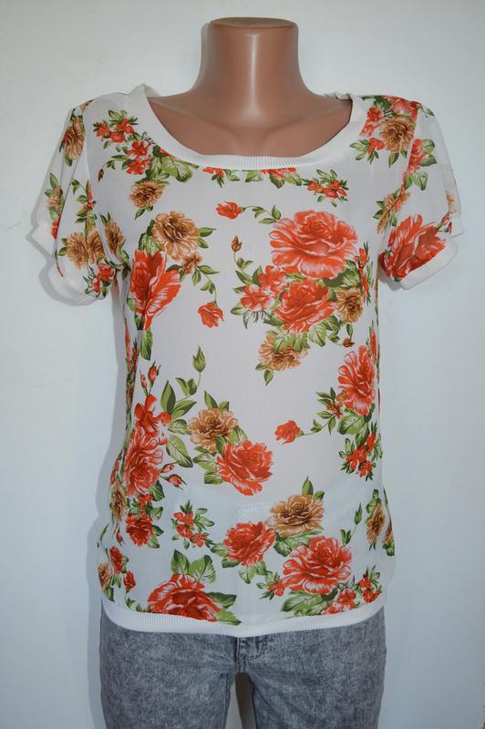 Шифоновая футболка в цветочный принт Terranova в отличном состоянии. Размер указан XS, отлично подойдет на S. Страна производитель: Бангладеш. Замеры: длина от плеча 58 см, ПОГ 45 см, ПОТ 44 см, ширина низа 40 см тянется до 45 см.