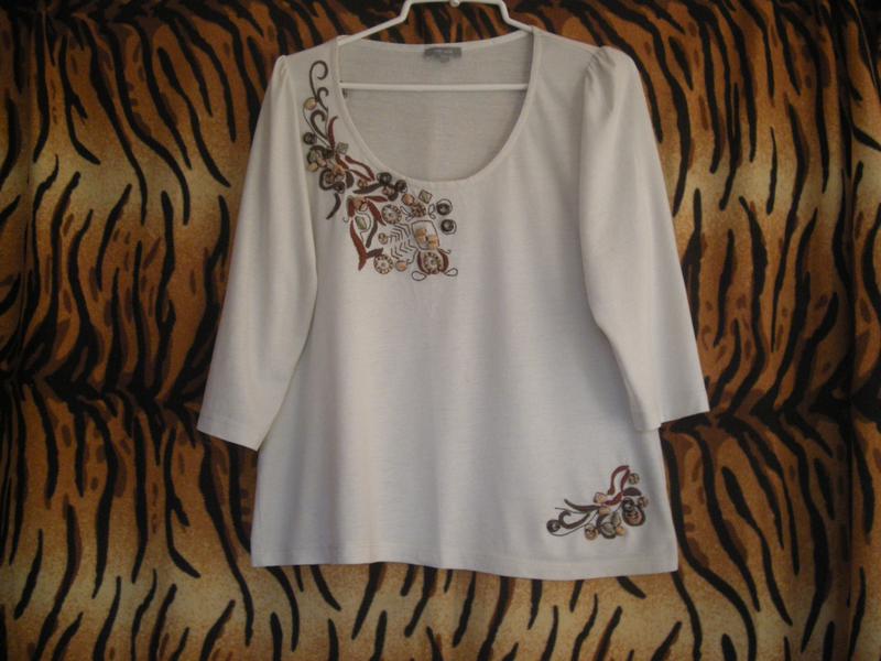 Футболка бежевого цвета,фирменная,большой полукруглый вырез,подшит снизу лентой,на правой стороне груди чудная аппликация из вышитых нитями листочков,а цветочки из деревянныхкружочков,бочонков,такая-же аппликация внизу слева,на правом плече тоже аппликация,объем груди-108см.,рукав длиной-44см.присобран сверху,длина-58см.