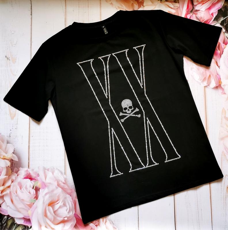 Стильная брендовая женская футболка c черепом и стразами. Все стразы впаянные. Новинка 2021 года отличного Премиум качества. Ооочень приятная к телу. Ткань: 95% коттон, 5% эластан (супер качество!!!) Размер: М/L. Производcтво: Турция.